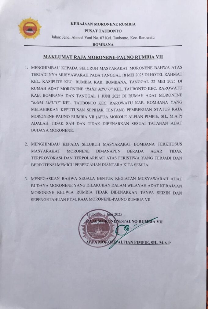 Wonuabombana.id- Musyawarah Besar (Mubes) Perangkat Kerajaan Moronene Keuwia Rumbia, yang dihadiri oleh seluruh perangkat kerajaan, menghasilkan 5 (Lima) Poin keputusan, yang telah disepakati, dan tetap mengakui bahwa Raja Moronene Keuwia Rumbia, Pauno Rumbia ke VII tetap PYM....
