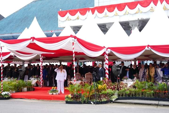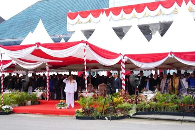 Gubernur Sulawesi Tenggara H. Ali Mazi saat bertindak sebagai Inspektur Upacara di Hari Ulang Tahun (HUT) Provinsi Sultra yang ke 59 di Depan Lapangan Upacara Kantor Gubernur Sultra.